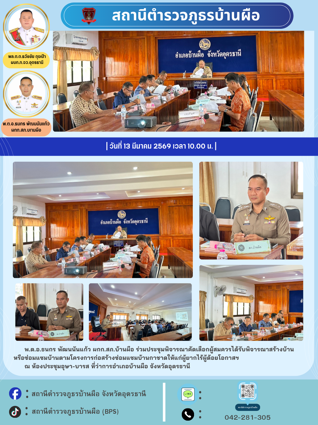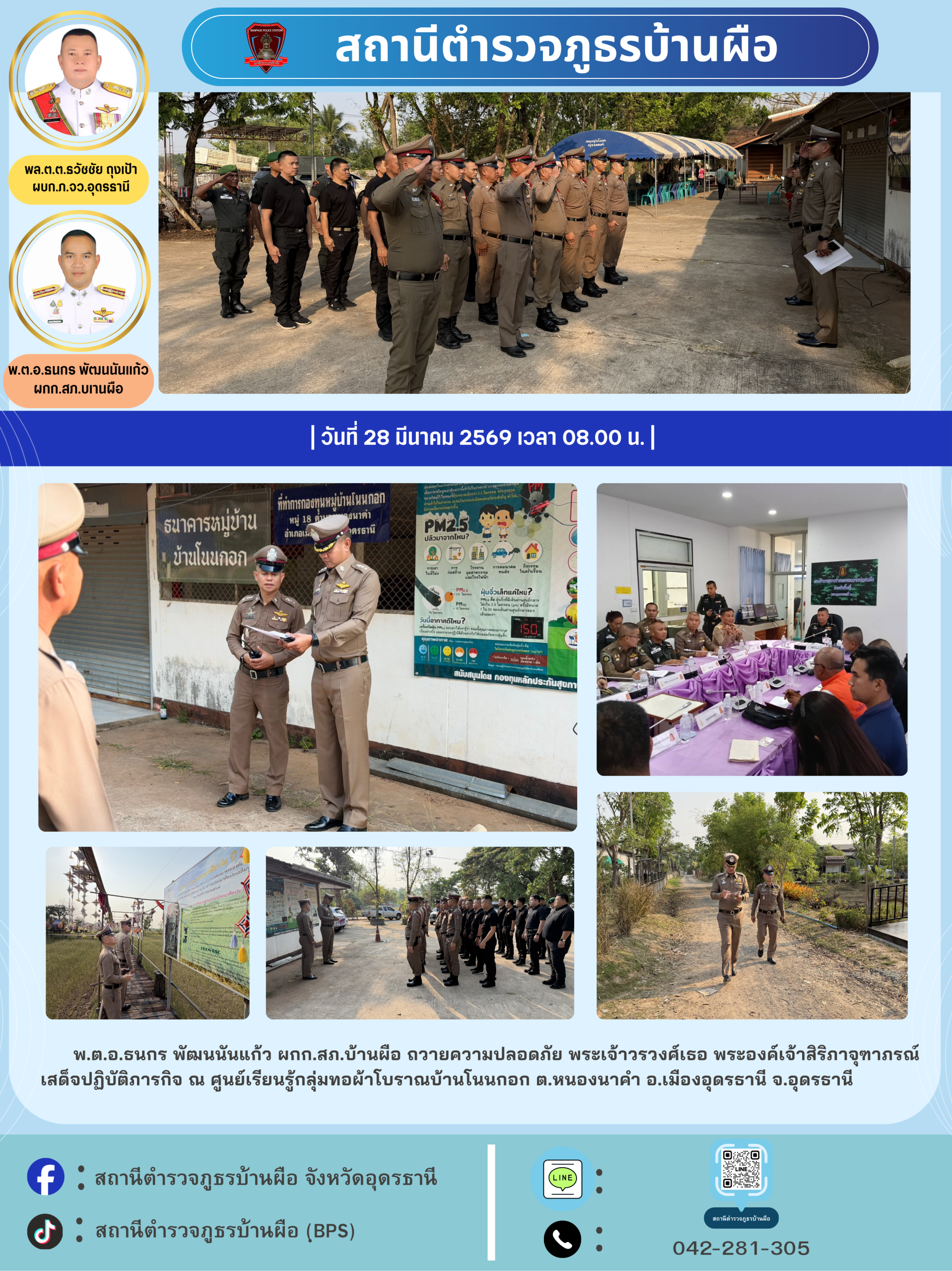 วันที่ 7เมษายน2569 เวลา 09.00น. สภ.บ้านผือ โดยการอำนวยการของ พ.ต.อ.ธนกร พัฒนนันแก้ว ผกก.สภ.บ้านผือ พ.ต.ท.อดิศักดิ์ สวัสดิ์พันธ์ รอง ผกก.ป.สภ.บ้านผือ มอบหมายให้ พ.ต.ท.ภูวนัย ใจเก่ง สวป.(ชส.) สภ.บ้านผือ พร้อมกำลังปฏิบัติชุดชุมชนสัมพันธ์ ลงพื้นที่หมู้บ้านชุมชนสัมพันธ์ บ้านหัวคู หมู่. 1 ต.บ้านผือ อ.บ้านผือ จ.อุดรธานี – ประชุมร่วมผู้นำหมู่บ้าน คณะกรรมการและชาวบ้านหัวคู – สำรวจปัญหาและแนวทางแก้ไข – ชี้แจงกระบวนการแก้ไขปัญหายาเสพติดร่วมกัน – รายงานการดำเนินการแก้ไขปัญหาที่ผ่านมา – ให้ความรู้การจราจรและรณรงค์ป้องกันอุบัติเหตุในช่วงเทศกาลสงกรานต์2569 ณ ศาลาประชาคม บ้านหัวคู หมู่.1 ต.บ้านผือ อ.บ้านผือ จ.อุดรธานี