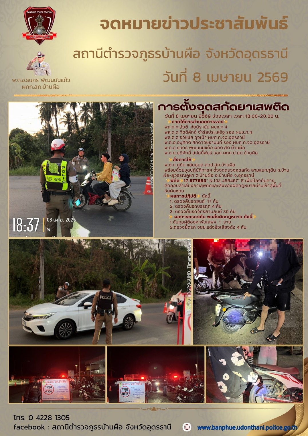 วันที่ 8 เม.ย.69 เวลา 18.00 – 20.00 น. 📌ภายใต้การอำนวยการของ 👮🏼♂️พล.ต.ท.สันติ ชัยนิรามัย ผบช.ภ.4 👮🏼♂️พล.ต.ต.กิตติศักดิ์ จำรัสประเสริฐ รอง ผบช.ภ4 👮🏼♂️พล.ต.ต.ธวัชชัย ถุงเป้า ผบก.ภ.จว.อุดรธานี 👮🏼♂️พ.ต.อ.อนุศักดิ์ ศักดาวัชรานนท์ รอง ผบก.ภ.จว.อุดรธานี 👮🏻♂️พ.ต.อ.ธนกร พัฒนนันแก้วผกก.สภ.บ้านผือ 👮🏻♂️พ.ต.ท.อดิศักดิ์ สวัสดิ์พันธ์ รอง ผกก.ป.สภ.บ้านผือ มอบหมายให้ 👮♂️พ.ต.ท.ภูดิส แสนอุบล สวป.ฯ พร้อมด้วย ร้อยเวร 2-0 สายตรวจรถยนต์ สายตรวจจราจร และชุดสืบสวน 🚨 ว.4 ตั้งจุดตรวจหรือจุดสกัด ณ หน้า สภ.บ้านผือ อ.บ้านผือ จ.อุดรธานี 17.677735 N, 102.45643° E เรียกตรวจยานพาหนะ รถยนต์ 17 คัน รถบรรทุก 4 คัน รถ จยย. 30 คัน ผลการตรวจค้น จับ ผตห. ขับเสพฯ 1 ราย และ ตรวจยึดรถ จยย. แต่งซิ่งเสียงดัง 4 คัน เหตุการณ์ทั่วไปปกติ